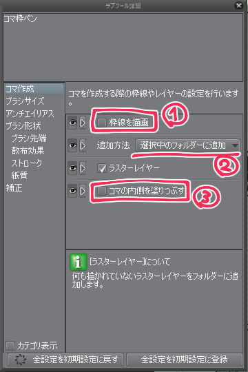 コマ枠ペンを使った簡単なぶち抜きコマの作り方 by 布袋紙袋 デフォルトのコマ枠ペンの設定を少しいじることで簡単に ぶち抜きコマ の作成ができます 1 コマ枠ペンを選択し ツールプロパティ もしくは項目がなければ サブツール詳細 を開きます.